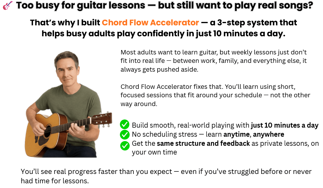 That’s why I created Chord Flow Accelerator. I took everything I’ve learned from decades of playing and teaching — along with my passion for music and helping others — and built a simple, proven system to help you skip the trial and error and start playing full songs faster.